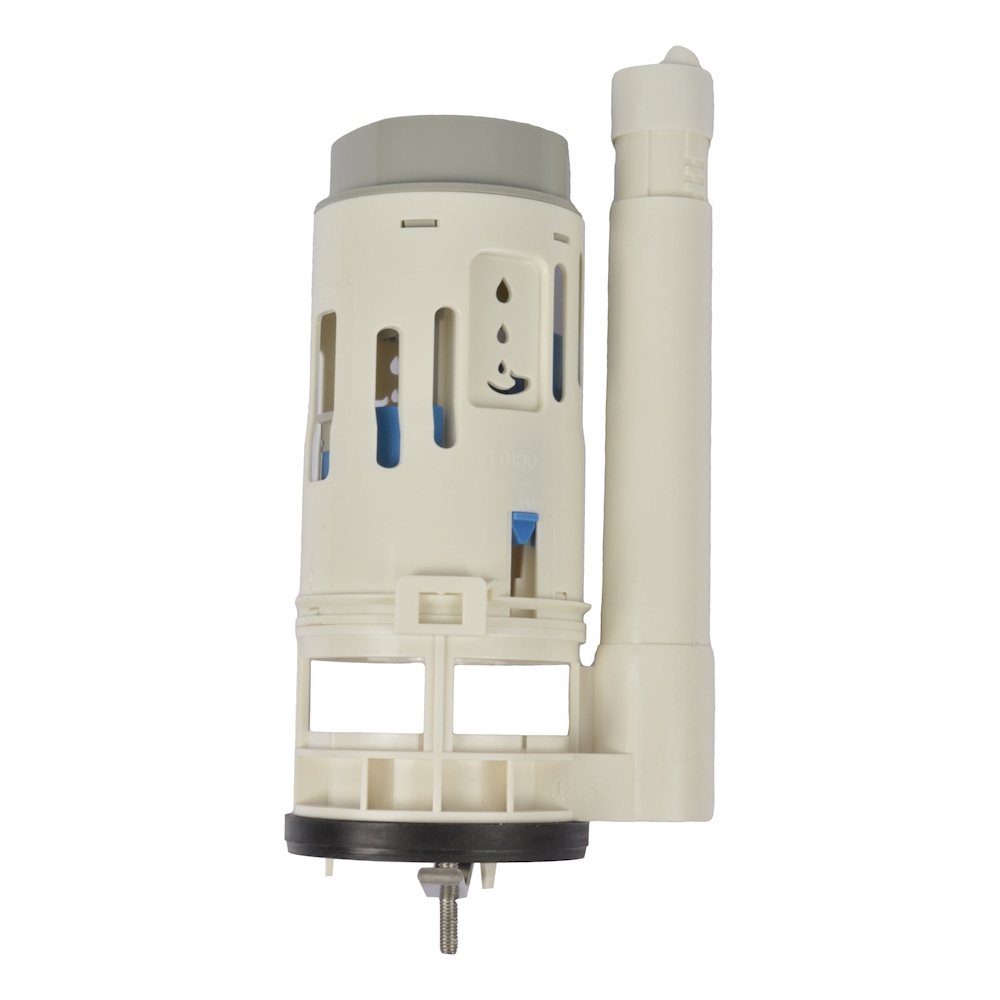 Válvula de descarga dual Coflex para sanitario de una pieza con descarga de 50 mm (2 pulgadas). Con sistema de descarga regulable en 2 niveles, parcial (líquidos) o completa (sólidos) para ahorrar agua hasta un 44 %. Cuenta con un tubo rebosadero con altura ajustable y un botón universal para aplicación en perforaciones de 38, 48 y 58 mm de diámetro. Además, es compatible con sanitarios de tanques muy bajos o muy altos. Con cuerpo de ABS, empaque de silicón y tornillo ancla de acero inoxidable.